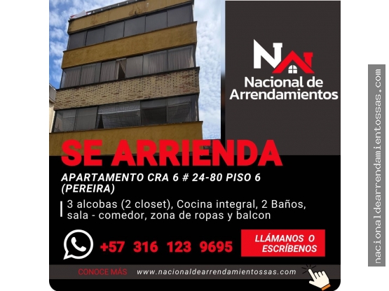 EN RENTA APARTAMENTO 6 CON 24 PISO 6 PEREIRA